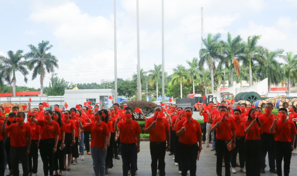 盛夏七月,热情似火!U8国际公司已是党旗飘扬,处处洋溢着喜庆祥和的气氛。当日上午,身穿“中国红”T恤的党员等参会人员有序入场,列队数字“100”庆祝图案,表达对中国共产党的无限热爱。随着主持人一声令下,伴随着激昂雄壮的国歌声,护旗手奋力将鲜艳的五星红旗抛向天空,国旗迎着清晨第一缕阳光冉冉升起,全体人员庄重注视国旗,高唱国歌,脸上写满了骄傲与自豪。